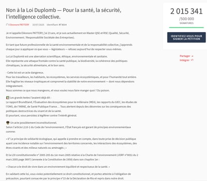 Deux millions de signatures ont été déposées sur le site de l'Assemblée Nationale, à la date du 28 juillet 2025, pour demander l'abrogation de la loi Duplomb rédigée par la FNSEA.