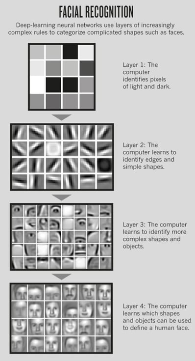 Pour reconnaître une personne, par exemple, la machine décompose l'image : d'abord le visage, les cheveux, la bouche, puis elle ira vers des propriétés de plus en plus fines (une cicatrice par exemple).