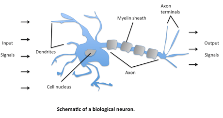Un neurone biologique peut être considéré comme la sous - unité d'un réseau de neurones dans le cerveau. Des signaux de grandeurs variables arrivent aux dendrites. Ces signaux d'entrée sont ensuite accumulées dans le corps cellulaire du neurone. Si le signal résultant atteint un certain seuil, un signal de sortie est généré qui sera transmis par l'axone.