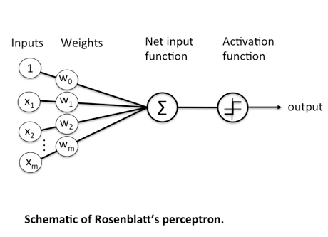 Avec le perceptron de Frank Rosenblatt (1957), il s'agit de trouver un algorithme déterminant les poids respectifs de signaux d'entrée pour aboutir à une fonction capable ou non de générer un signal. C'était un système mono-couche qui n'avait qu'une seule sortie à laquelle toutes les entrées étaient connectées.